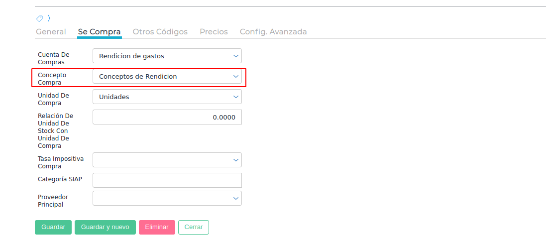 Ingresar al producto correspondiente y corroborar que en el campo concepto compra tenga seleccionada la opción “CONCEPTO DE RENDICIÓN”