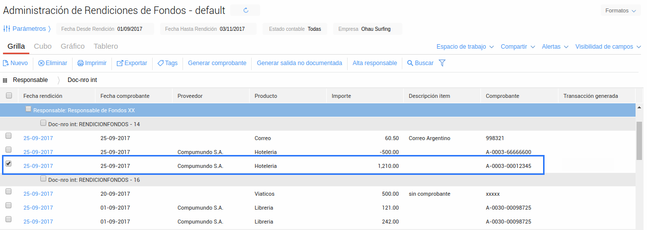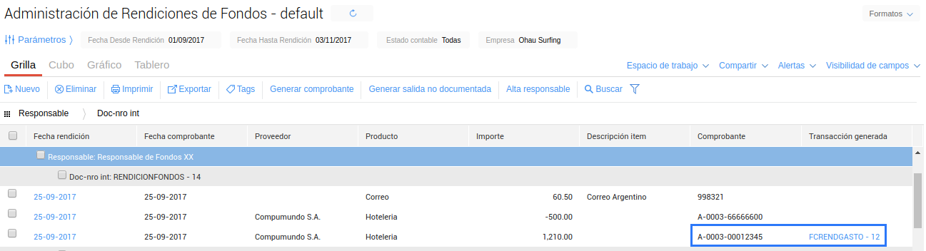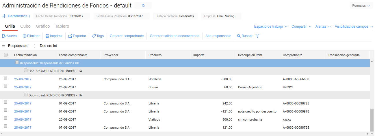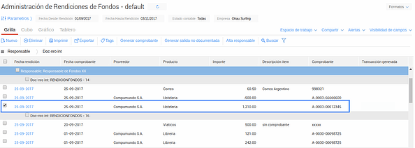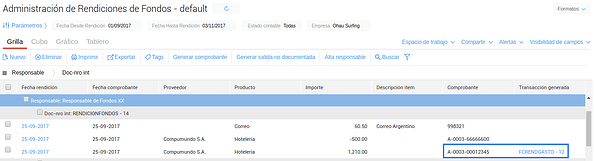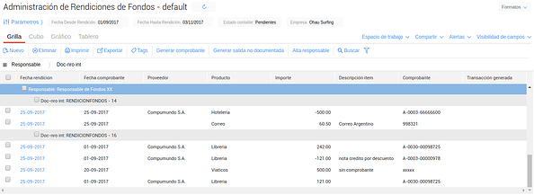 La grilla muestra todos los ítems/comprobantes informados en las distintas rendiciones agrupados por Responsable/Rendición con todos los datos registrados por el Responsable de fondos.