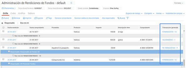 El documento generado se muestra luego, en la columna Transacción Generada de la grilla.