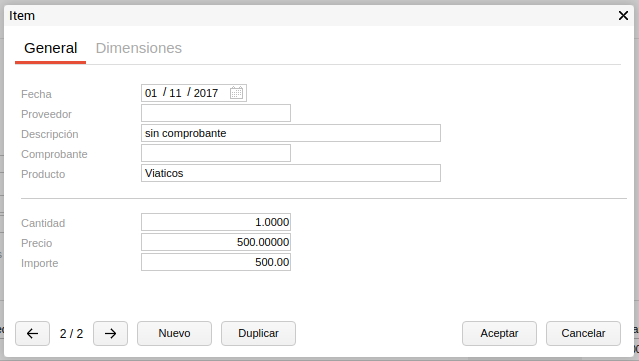 Al guardar se genera el documento correspondiente y se genera el Asiento que cancela la cuenta puente Rendición de Gastos y se imputa en el Debe a la cuenta de resultados configurada en la solapa compras del producto, heredando las dimensiones que haya indicado el usuario en la Rendición.