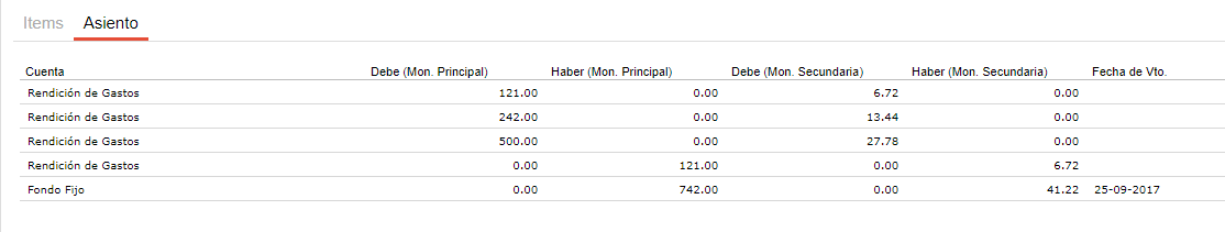El asiento de la Rendición de Fondos se genera debitando una cuenta puente llamada Rendición de Gastos (una línea por cada ítem cargado) contra la cuenta Fondo fijo.