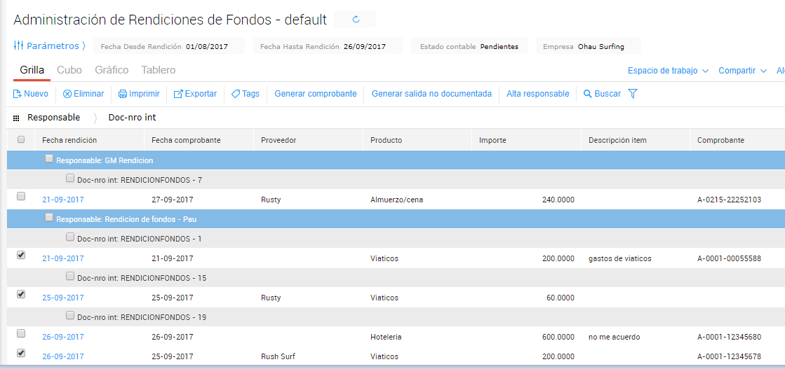 En este caso, es posible seleccionar gastos de distintas Rendiciones siempre que sean del mismo Responsable de Fondos.