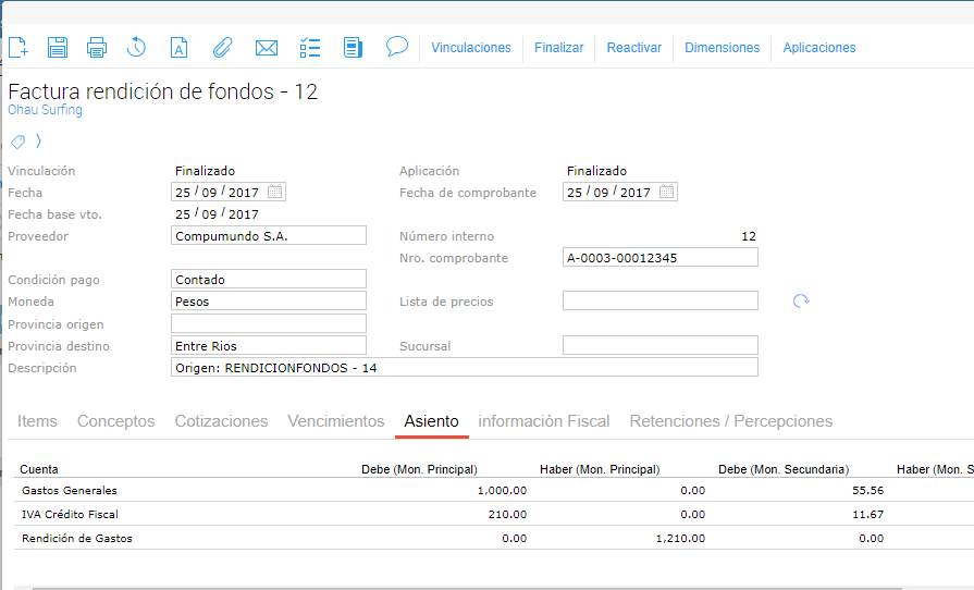 Al guardar se genera el documento de Factura correspondiente y se genera el asiento que cancela la cuenta puente Rendición de gastos, y se imputa a la cuenta de resultados configurada en la solapa compras del producto y se heredan las dimensiones que indicó el usuario en la Rendición.