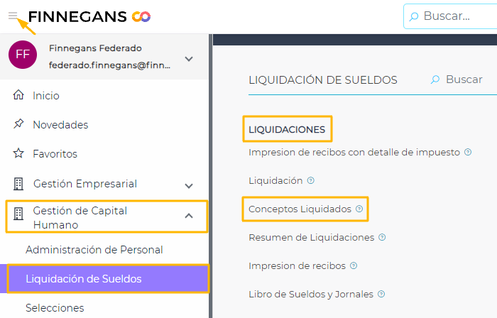 - Para ingresar a dicho maestro debemos ir al Menú > Gestión de Capital Humano > Liquidación de Sueldos > Liquidaciones > Conceptos Liquidados.