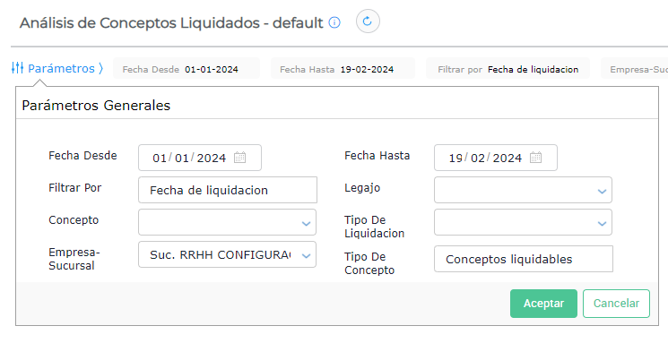Concepto: Se puede seleccionar uno o varios conceptos, si no se completa el resultado será todos los conceptos de las liquidaciones que se encuentran dentro del periodo establecido.