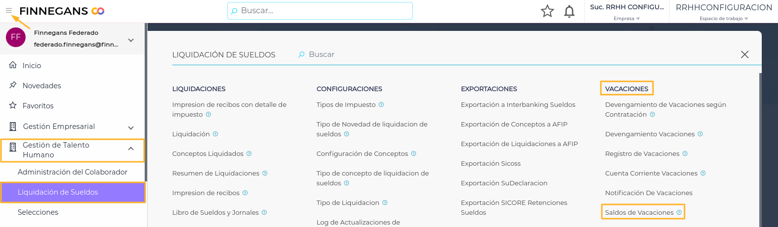 - Para ingresar a dicho maestro debemos ir al Menú > Gestión de Talento Humano > Vacaciones > Saldos de Vacaciones.
