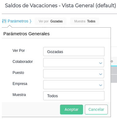 Ver Por: Indicar si se desea ver el saldo de las vacaciones gozadas o pagadas.
