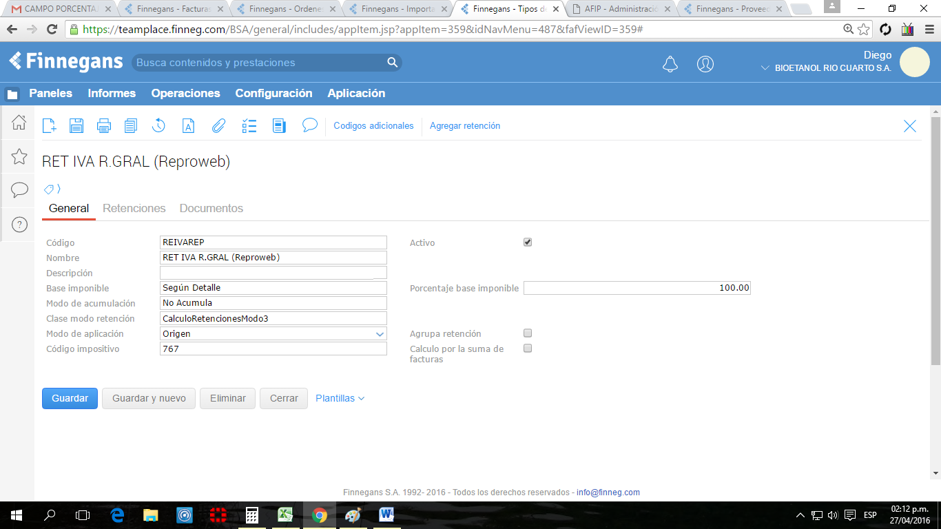 Debemos ahora seleccionar el tipo de retención que corresponde a iva