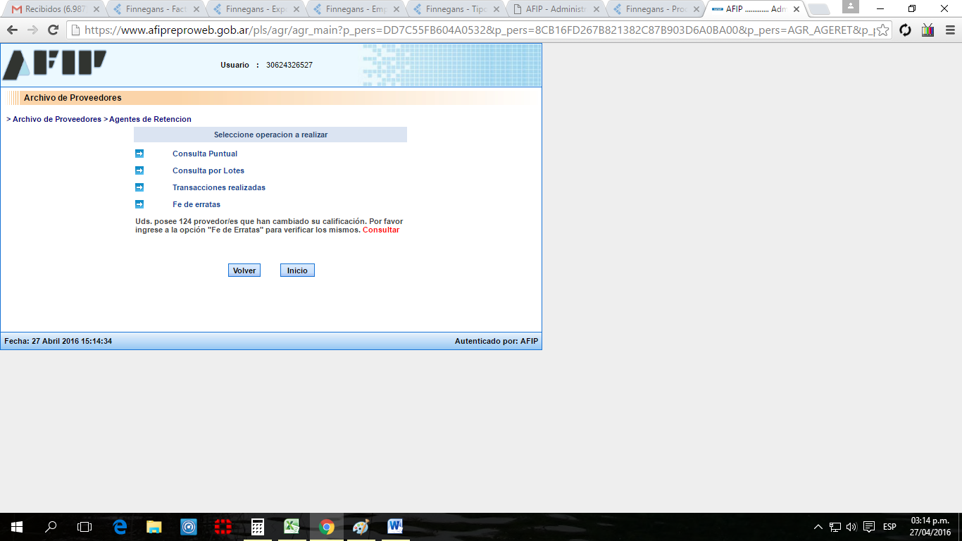 Luego, se exporta a TXT un informe con todos los terceros que sean Proveedores. Dicho informe (padrón) se importa en https://www.afipreproweb.gob.ar > Informes / Contabilidad / Impuestos / Reproweb / Importación de Retenciones Reproweb, quien devuelve un txt con códigos de respuesta de acuerdo a la situación fiscal de los contribuyentes informados.