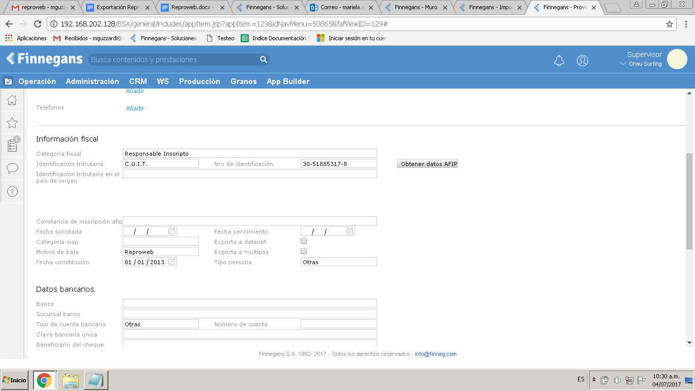 - “3”, si el proveedor no reviste el carácter de responsable inscripto en el impuesto al valor agregado. El cual marca la baja del proveedor por reproweb. En el maestro de proveedores, el campo de motivo de baja especifica que fue por reproweb y lo “inactiva” para inhabilitar cualquier pago. Luego, si al volver a importar el archivo, la situación del proveedor cambia, es decir, el código de reproweb dejó de ser 3, por ende el sistema lo activa nuevamente y saca el motivo de baja.