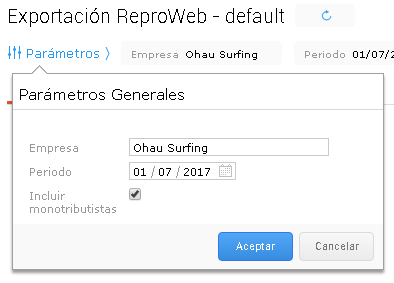 Al ingresar, se muestran los parámetros, donde se indica la empresa, el período deseado y un check donde incluye a los terceros cuya categoría fiscal es monotributo.