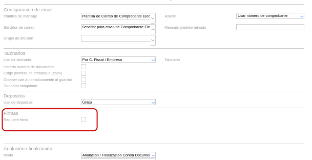 Lo primero que se debe tener en cuenta es que para indicar si un documento de tipo Operación (Pedido, Orden de Compra, Factura, etc) u Operación Tesorería (Orden de pago, Prepago, etc) debe ser firmado se debe configurar el apartado de “Firmas” con el check de “Requiere Firma”: