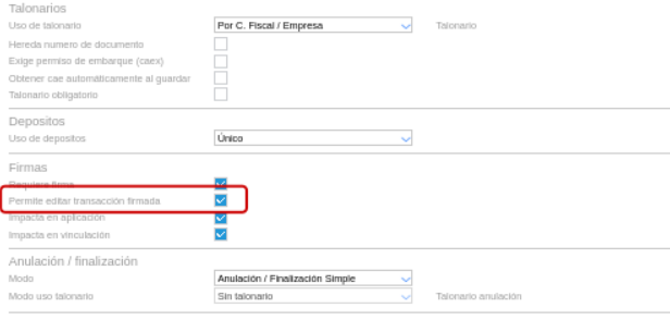 Por su parte, si se desea editar transacciones que ya hayan sido firmadas se debe activar el check “Permite editar transacción firmada” en los tipos de documentos correspondientes: