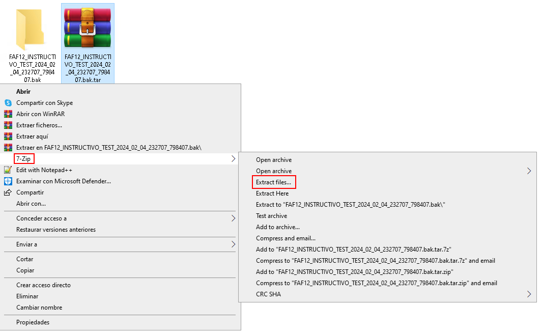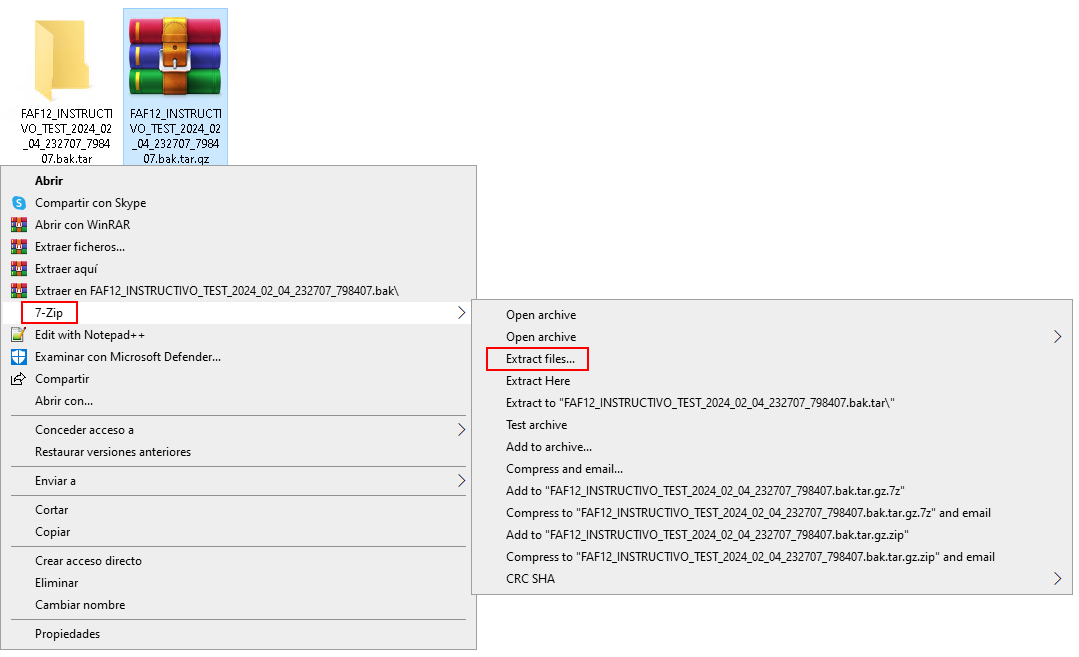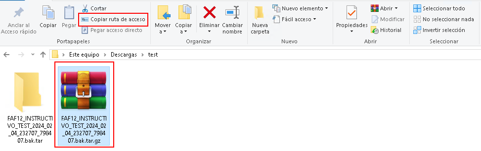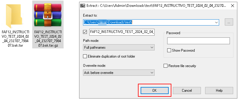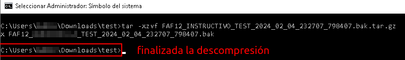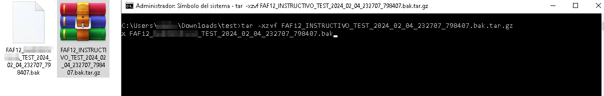 tar -xzvf “C:\ruta\del\comprimido\FAF12_INSTRUCTIVO_TEST_2024_02_04_232707_798407.bak.tar.gz” (pegar la ruta copiada en el paso 1 con CTRL + V)