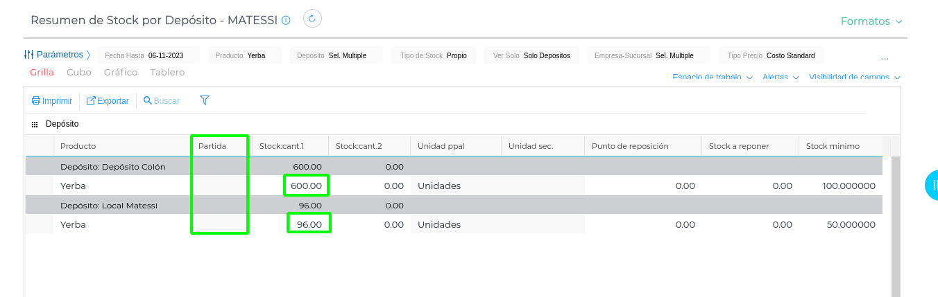 Por ejemplo el producto “Yerba” utiliza partida pero el informe solo indica la cantidad total, sin diferenciar el stock por partida: