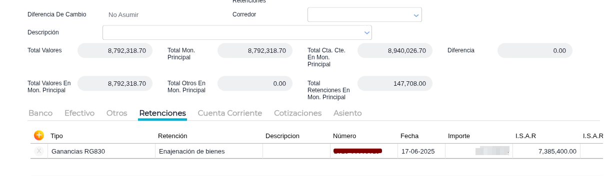 - Primero revisamos en el maestro de Tipos de Retención, como está configurada la retención de Ganancias RG 830: