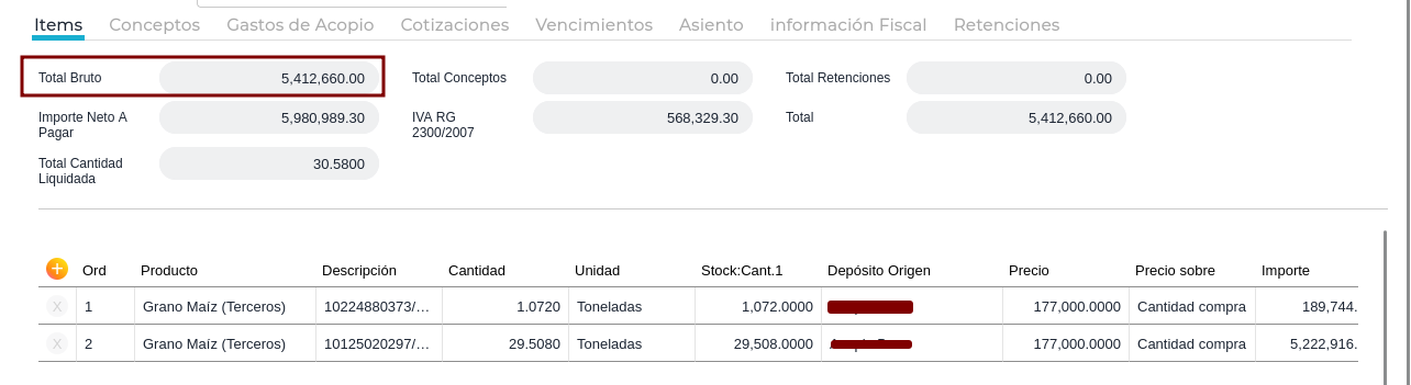 - Tenemos una Liquidación Secundaria de compra de granos, la cual tiene dos actores: proveedor y corredor, cuyo total bruto es el siguiente