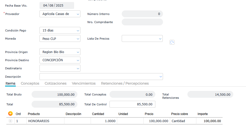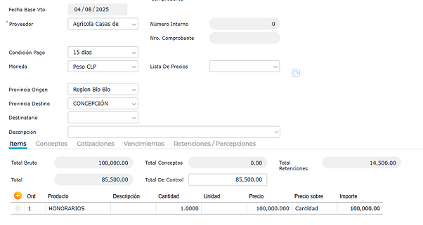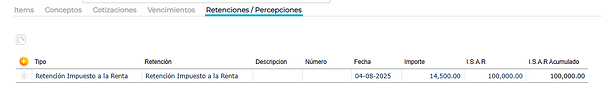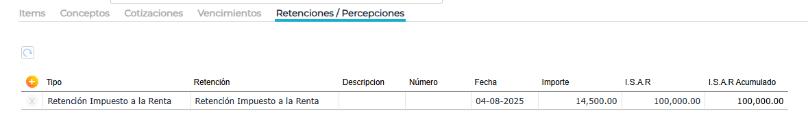 Al cargar la factura se observa que el sistema calcula de forma automática la retención