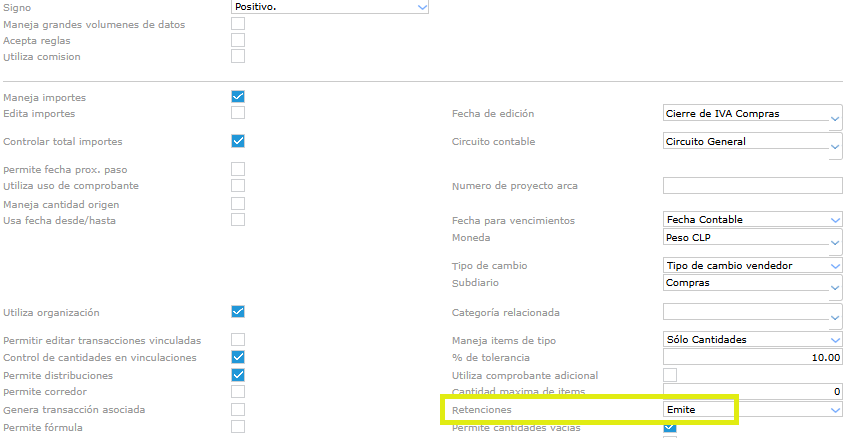 En la solapa general, en el campo Retenciones debe configurarse EMITE