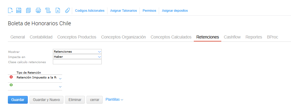 En el tipo de documento, Boleta de honorario o Boleta de prestación de servicios a terceros se debe configurar en la solapa Retenciones, la retención creada anteriormente, impactando en el haber