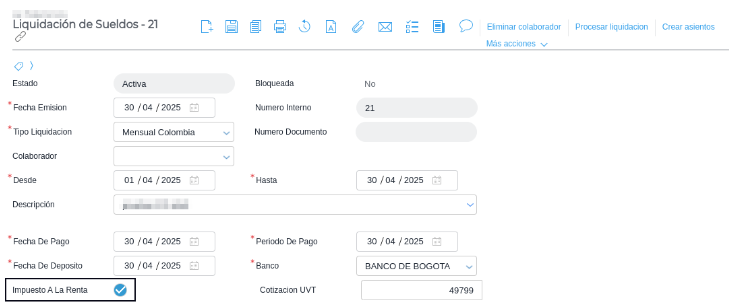 - Al procesar la liquidación se calcularán todos los montos necesarios para poder determinar la Base gravable y determinar por escala la Retención en la fuente.