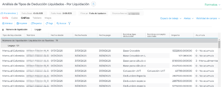 Para poder controlar los importes calculados a lo largo del cálculo, utilizar el reporte Análisis de Tipos de Deducción Liquidados.