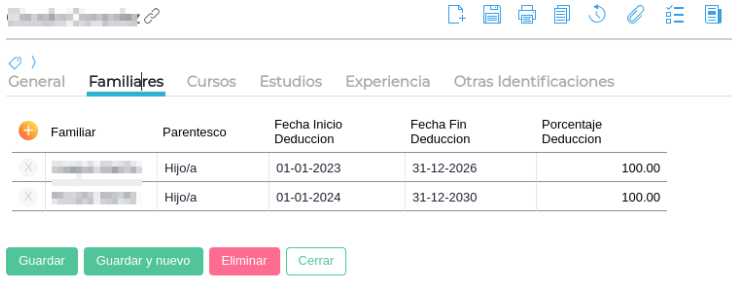 Tipo de deducción = Modo de cálculo 1, conceptos asociado Deducción Familiares. Signo Resta. Obligatoria. Orden 120