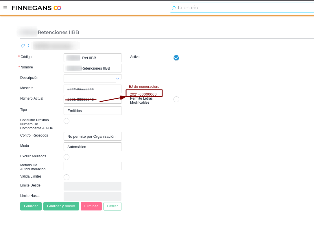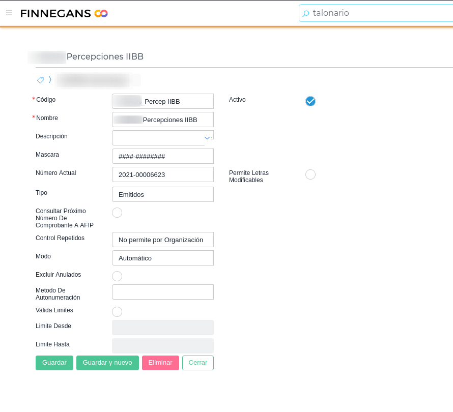 (Menú → Configuración → Empresas → Talonarios)