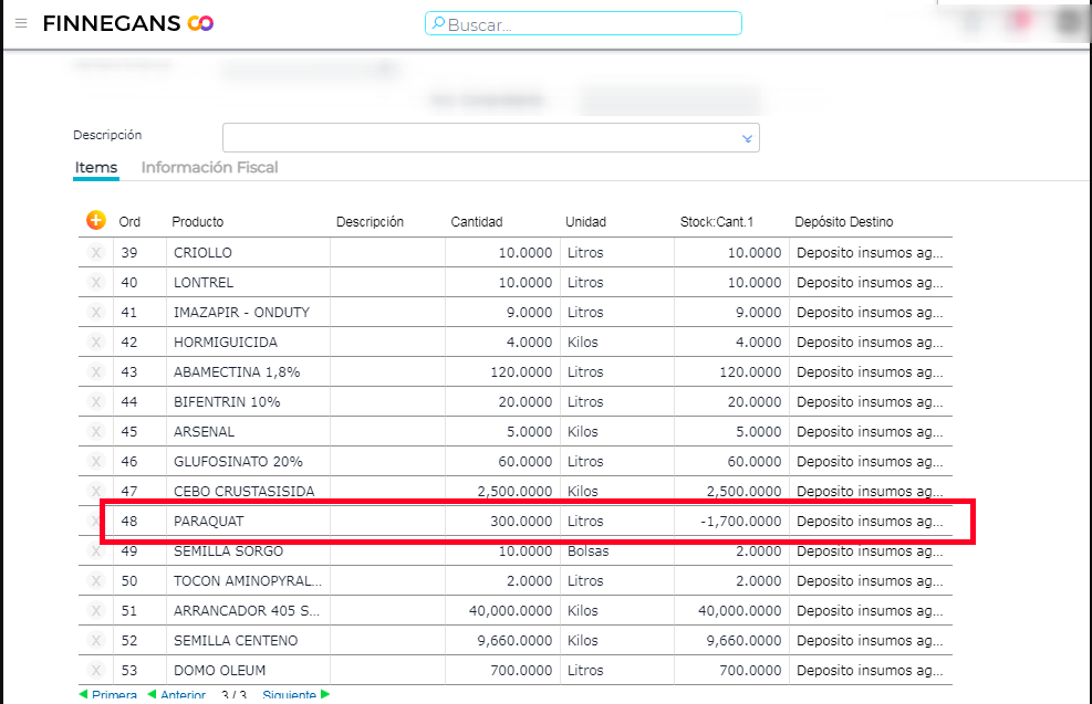 Cómo podemos ver, se desea consumir 300 lts del producto PARAQUAT. Sin embargo, en stock, nos aparecen -1700 lts. (cuando en realidad disponemos de 1700 lts para usar).
