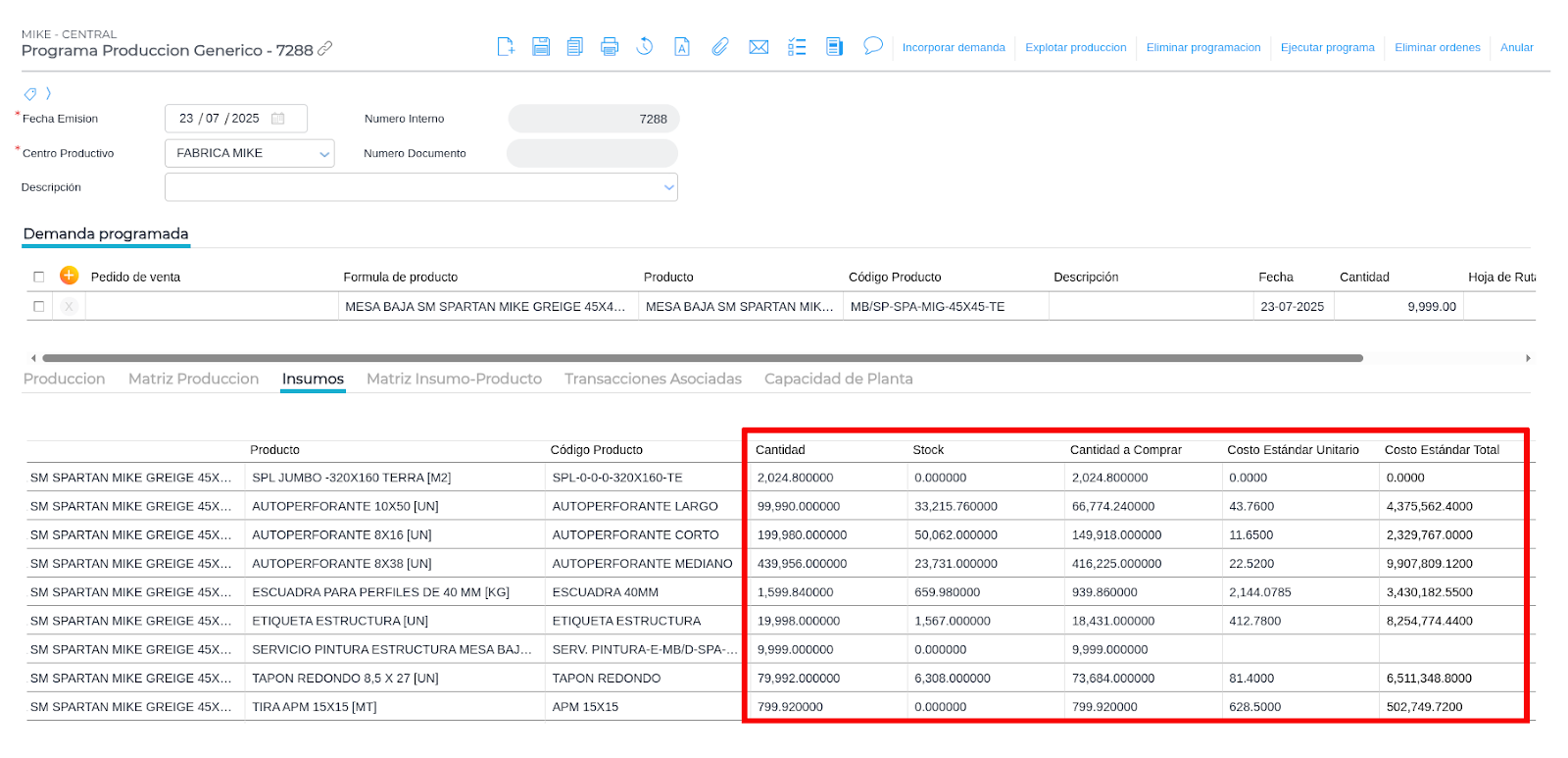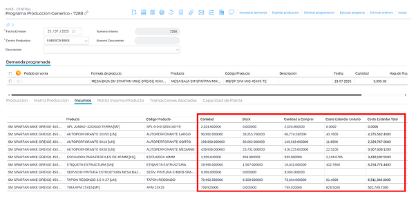 Esta mejora permite mostrar los valores numéricos de cantidades y costos con separador de miles dentro del Programa MRP, tanto en la solapa Producción como en la solapa Insumos, para facilitar la interpretación de grandes volúmenes de información.