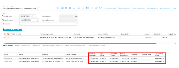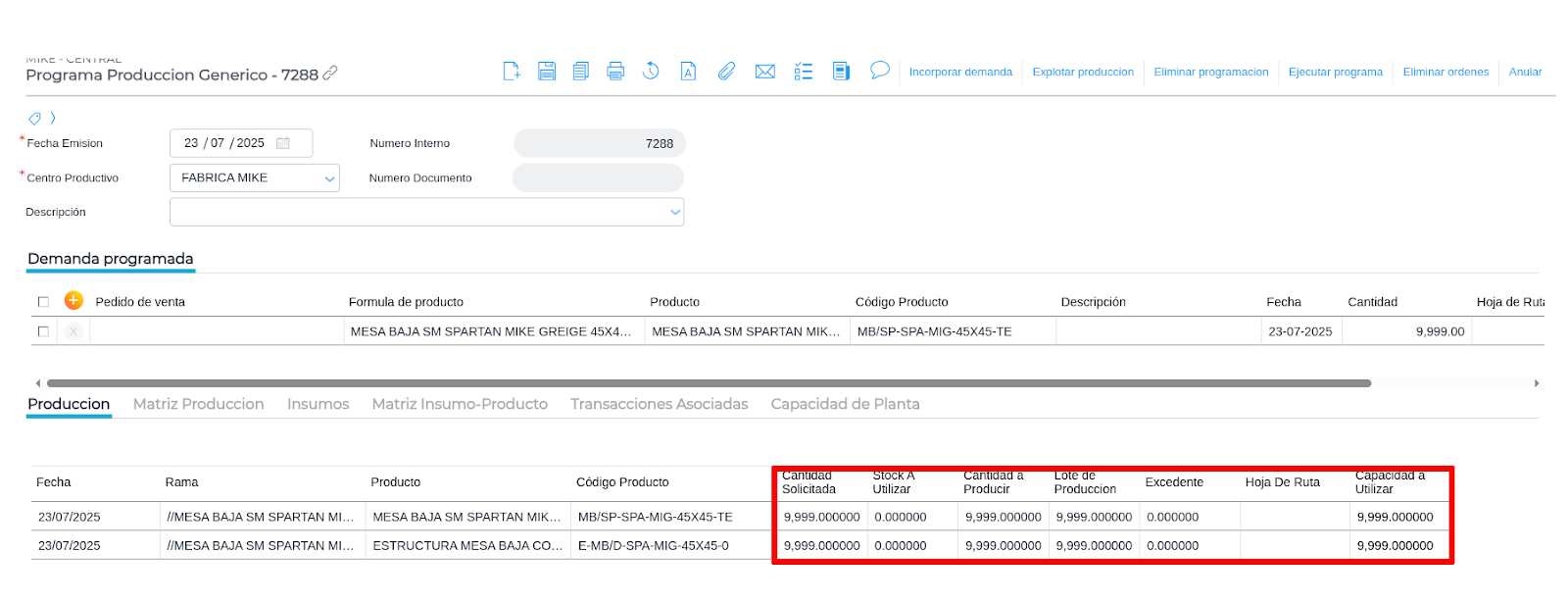 - Ingresar una demanda con fórmula de producción y cantidad significativa (ej. 75.000).