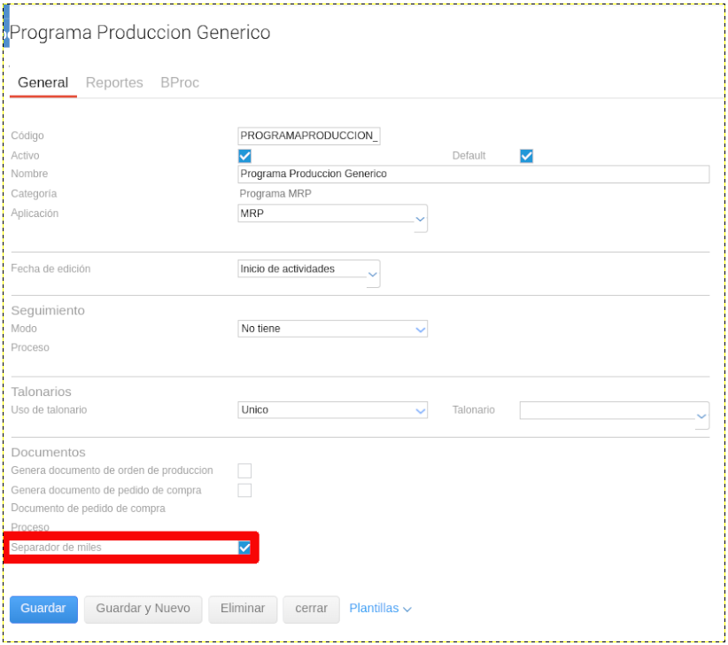 - Seleccionar el tipo de documento con categoría “Programa MRP” donde se haya activado el campo “Separador de miles”.