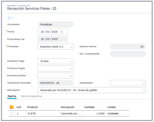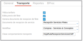 - Generar documento de recepción de flete: Debe estar el check seleccionado para que se genere el documento de recepción si en la condición de flete de la hoja de ruta se seleccionó a pagar