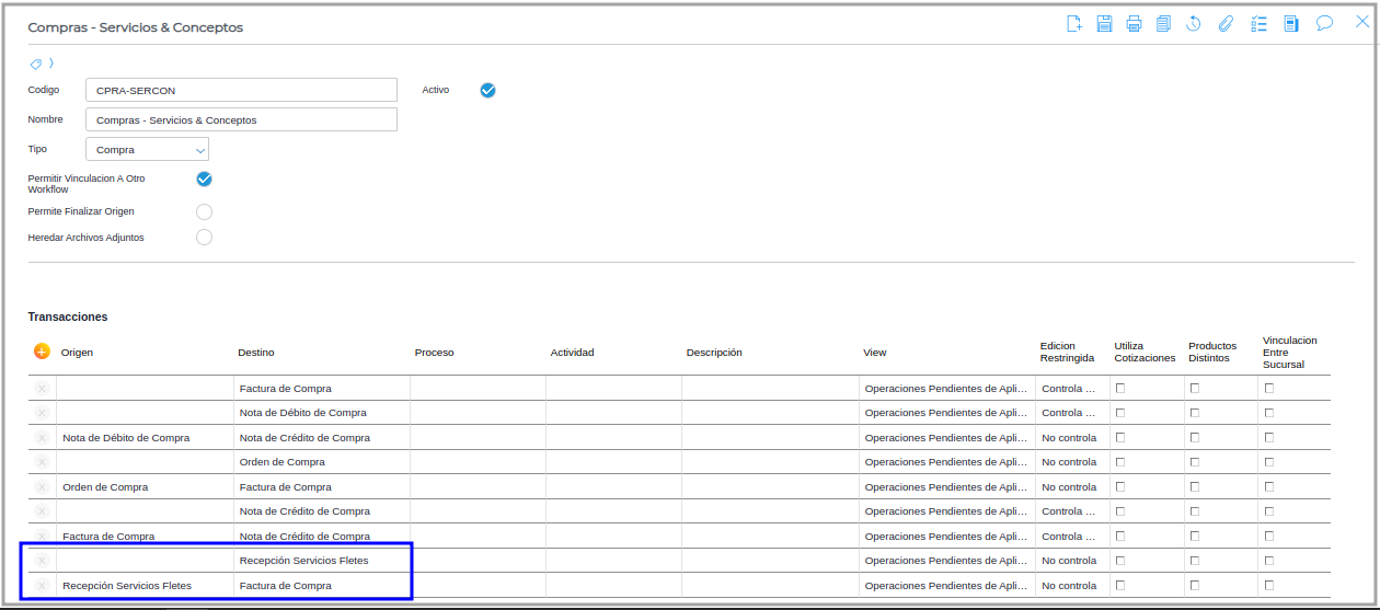 y debe estar configurado en el workflow de Compras - Servicios & Conceptos como se presenta en la siguiente imagen:
