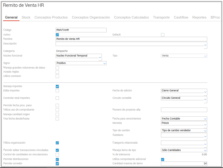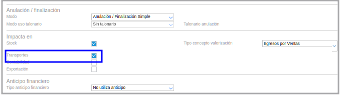 Configurar un Tipo de documento Remito de venta dentro de la categoría despacho seleccionado el check en transporte: