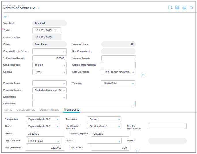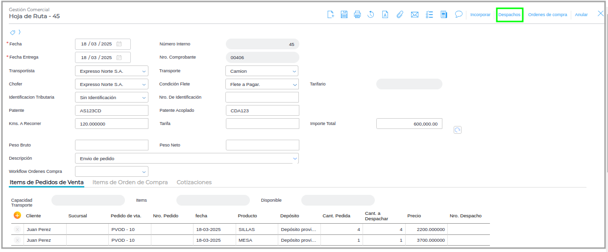 Esto va a permitir que al momento de generar los despachos desde la Hoja de ruta se hereden los datos del transportista.