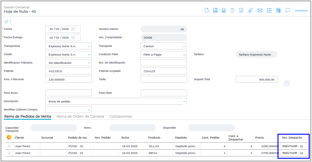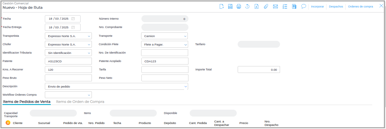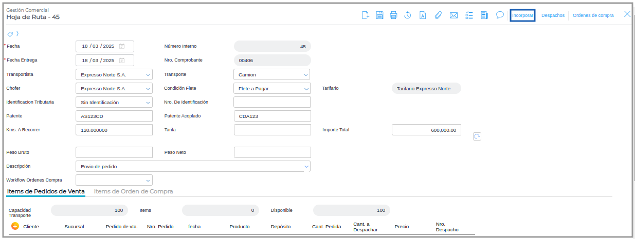 Paso 3 - Una vez creada la Hoja de Ruta se completará el tarifario y el importe total, se deberá incorporar los items de pedidos de ventas desde el botón incorporar: