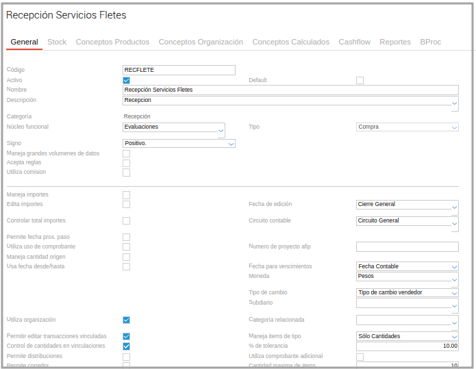 Configurar un tipo de documento Recepción de servicios de Flete cuya categoría sea Recepción: