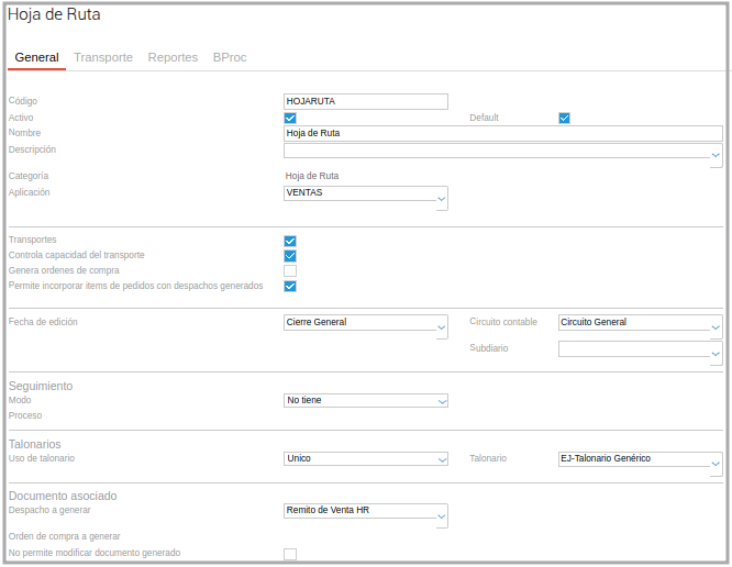 Dentro de la configuración del tipo de documento Hoja de ruta configurar la solapa transporte