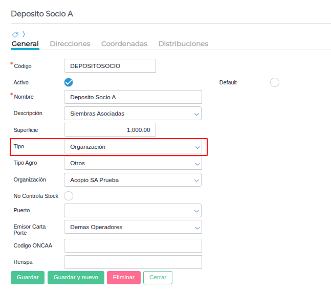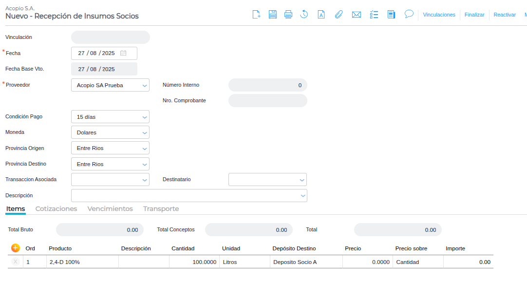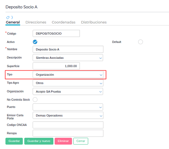 Seleccionar el depósito destino, que debe ser el depósito del socio creado previamente.