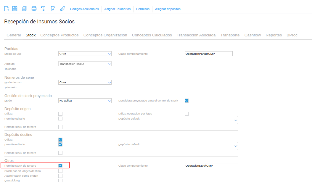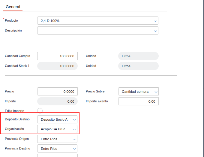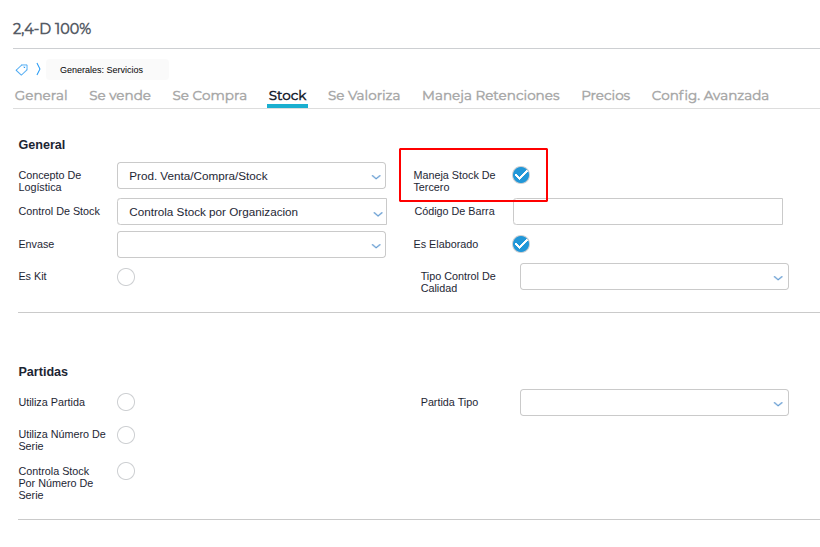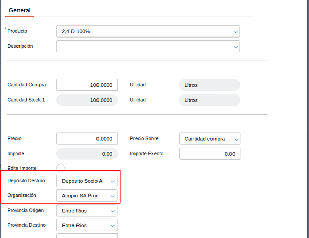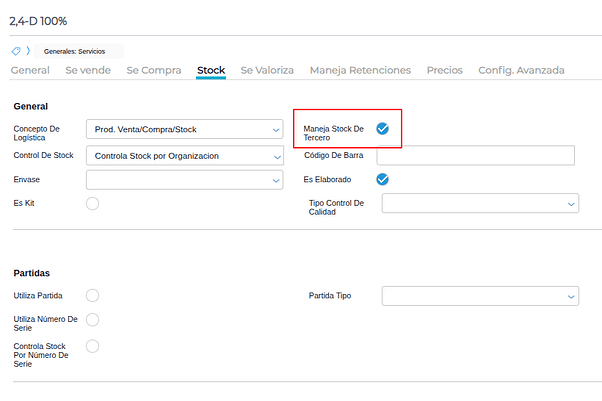 En el campo Organización, indicar la organización del socio solo si se trata de stock de terceros.