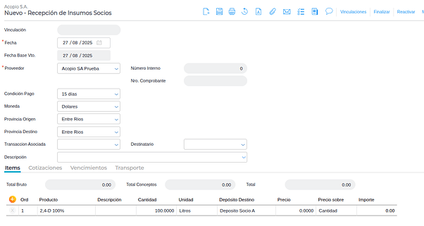 El presente instructivo tiene como finalidad guiar paso a paso la configuración y el uso de Recepción de Insumos Socio en el sistema, asegurando que los depósitos, productos y tipos de documentos estén correctamente definidos, y que el registro de los aportes de insumos por parte de los socios se realice de manera ordenada y consistente.