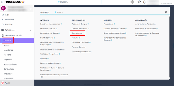 - Ingresar a: Gestión Empresarial > Compras > Recepciones.