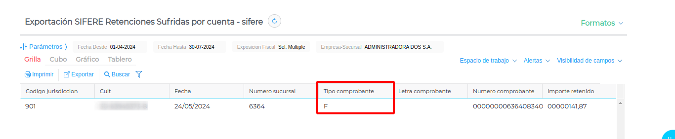 Para la presentación de IIBB a través del aplicativo SIFERE es necesario que la columna “tipo de comprobante” tenga como código impositivo la letra F en mayúscula.
