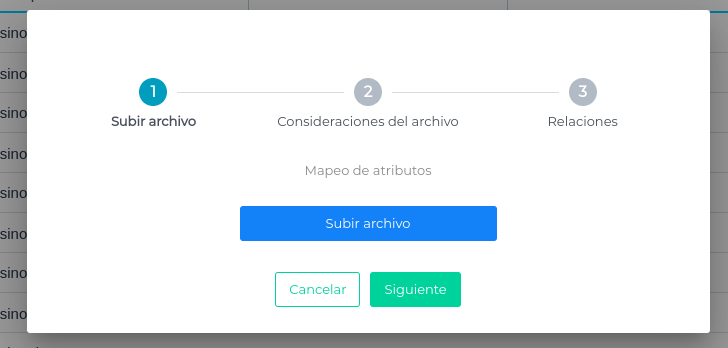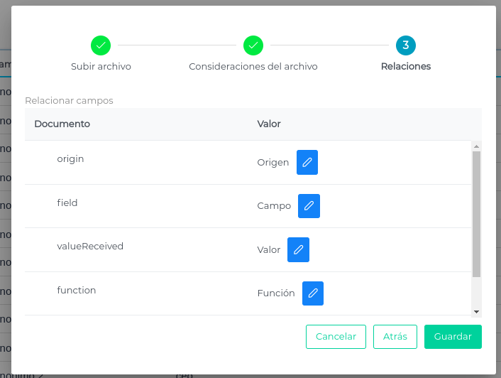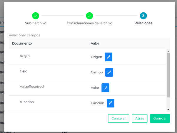 Importar: para importar un excel con las columnas función y sinónimos completas, debe validar que las columnas sean las mismas, esta pantalla es la misma que la utilizada para mapeo dinámico, para más información consulte el manual de usuario de deals.