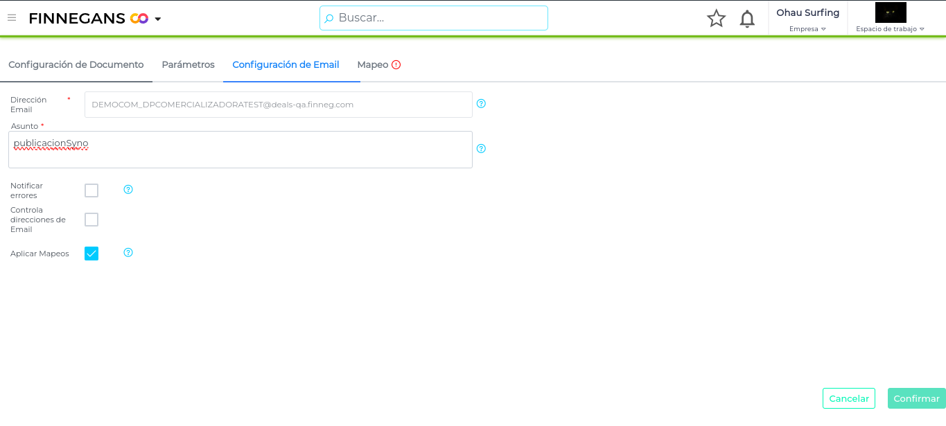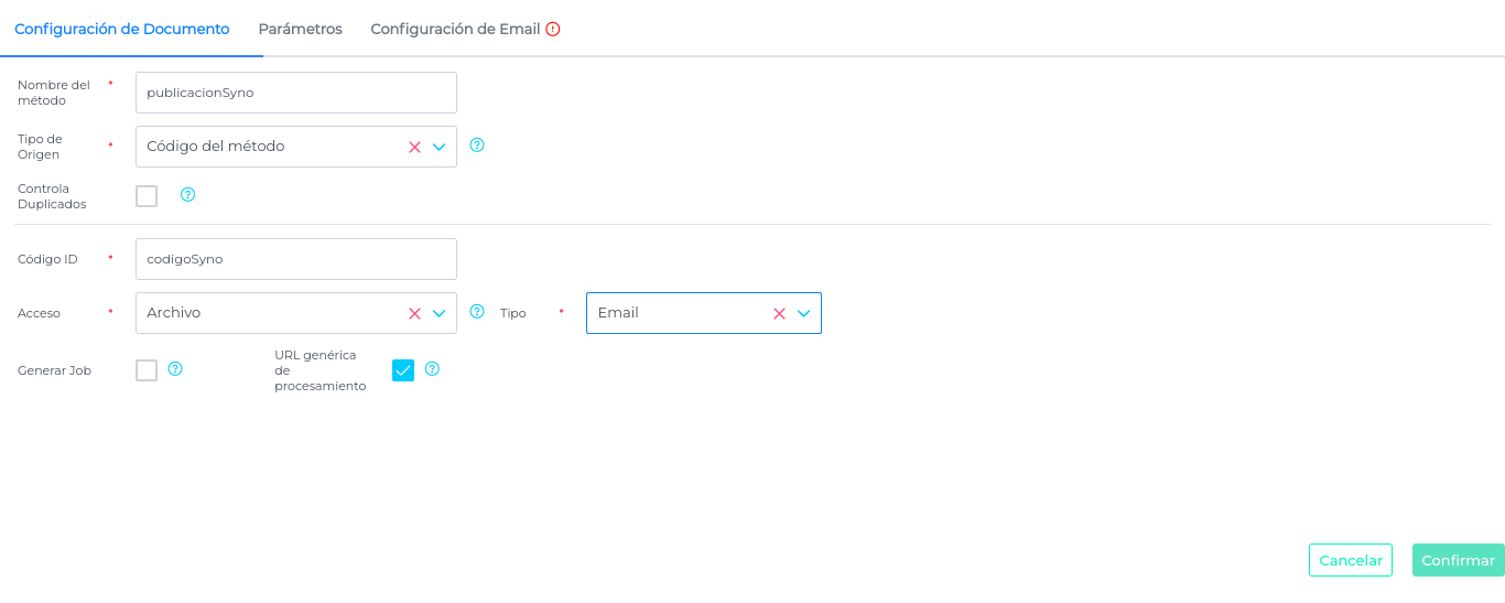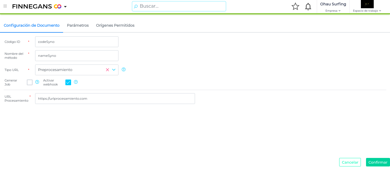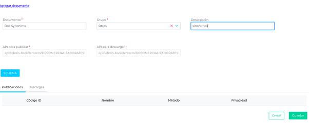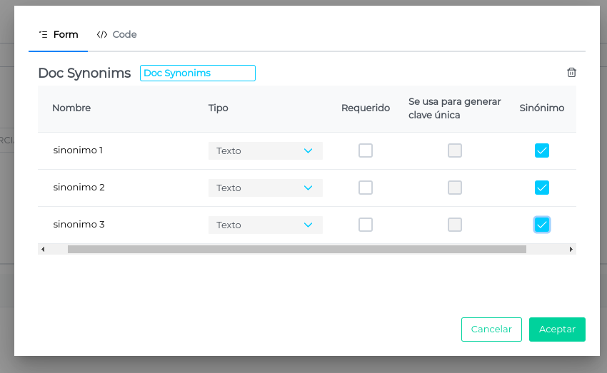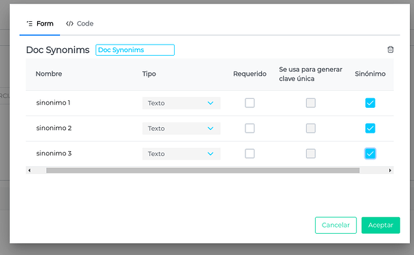 Por defecto, el documento debe tener definido qué campos son sinonimizables, en la sección de SCHEMA en el catálogo de documentos se deben marcar los campos que requieran sinónimos. Si el documento es privado, los campos sinonimizables son definidos por el cliente, en caso de ser público o estándar, es definido por Finnegans.