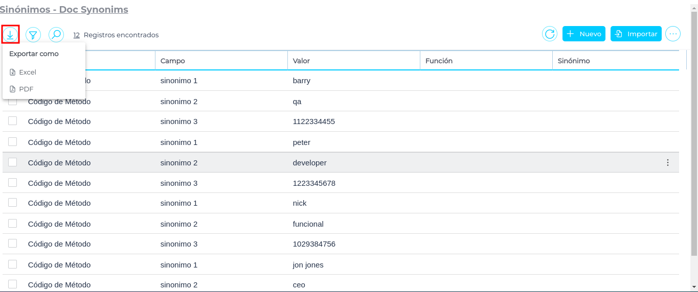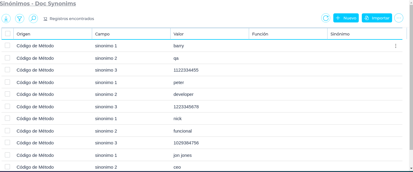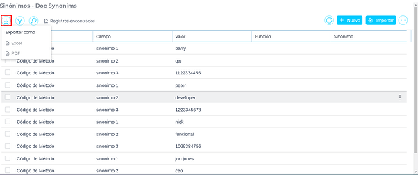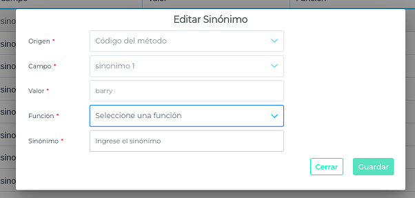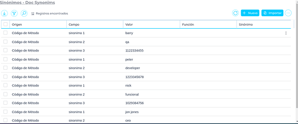 -Sinónimo: Esta columna es el código REAL asignado para esos campos, se puede editar y también eliminar un sinónimo.