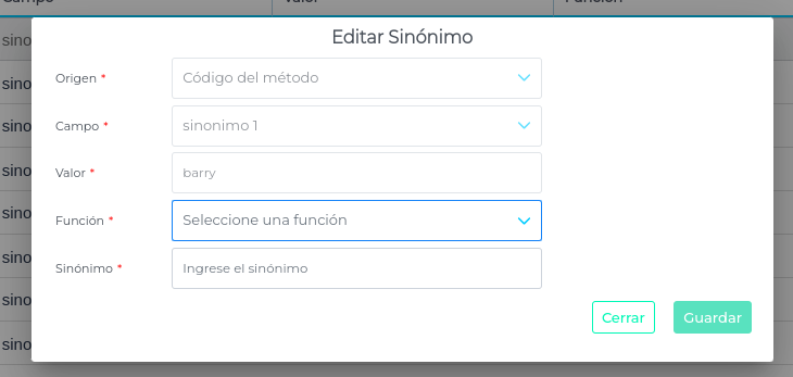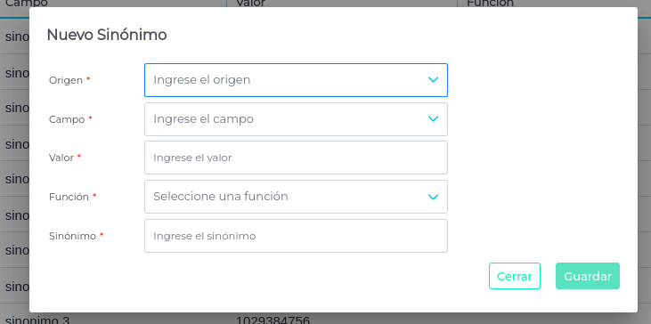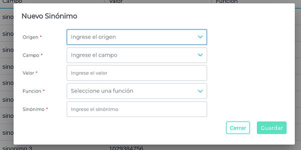 Tambien en esta grilla tenemos la posibilidad de “crear nuevo” (esto sirve para que el usuario si de antemano sabe que sinónimos tiene para cargar pueda hacerlo) en caso de hacerlo, veremos un popup de ingreso manual, que va a pedir los mismos campos que ya tiene la grilla: