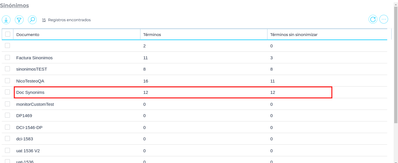 -Términos: Indica la cantidad de sinónimos que tiene configurado cada documento