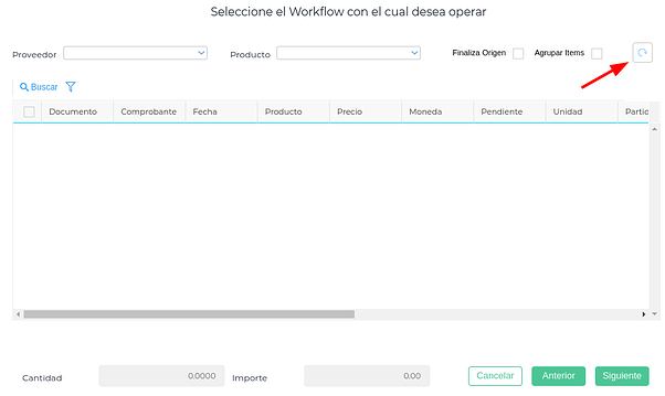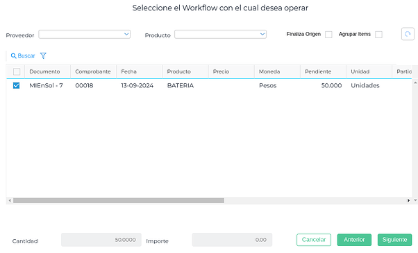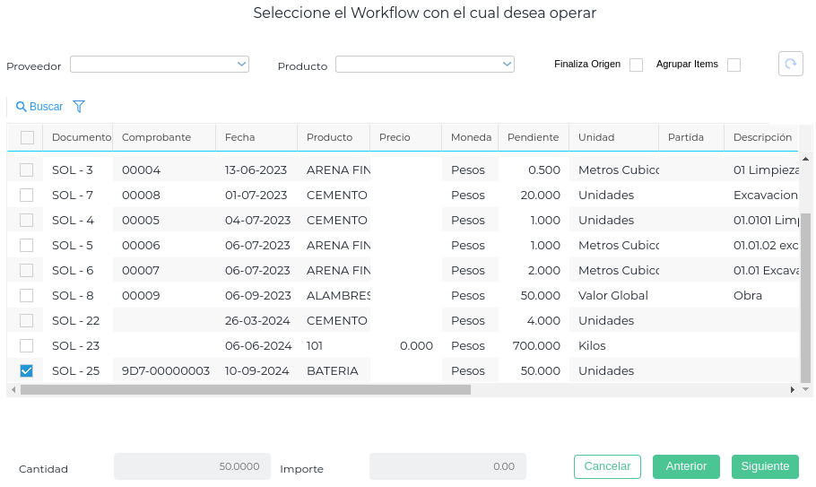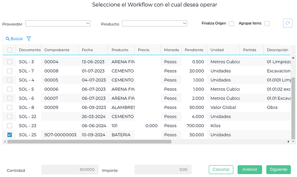 Aparecerá el listado de las Solicitudes de Compra pendientes y se selecciona una o más: